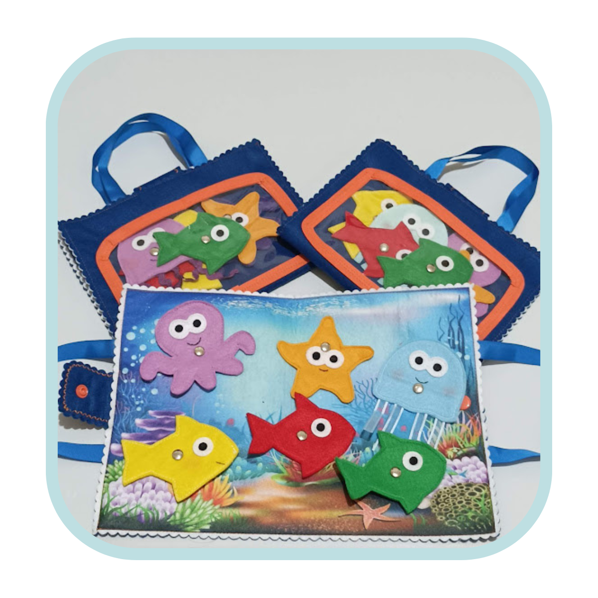 Feita em feitro vira uma bolsinha para que a criança aprenda brincando como guardar seu brinquedo e